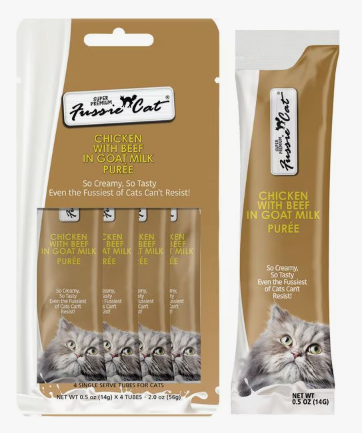 Fussie Cat Super Premium Chicken with Beef in Goat Milk Puree Lickable Cat Treats, 2-oz pouch