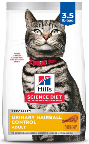 Hill's Science Diet Urinary Hairball Control, Adult 1-6, Urinary Track Health & Hairball Control Support, Dry Cat Food, Chicken Recipe, 3.5 lb Bag